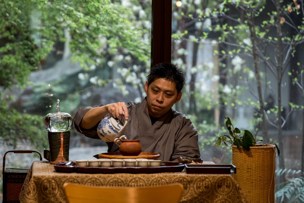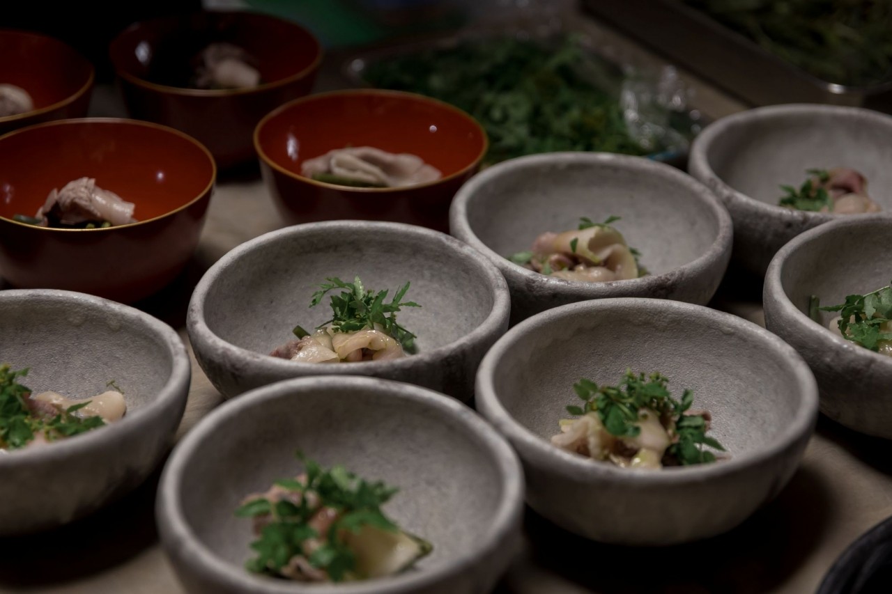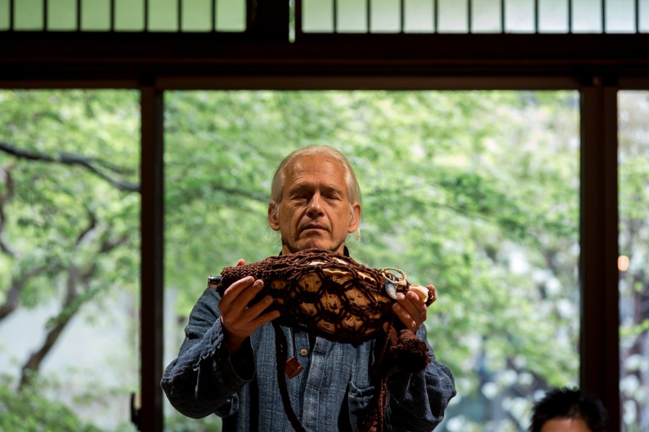 青々とした香りが満ちる北国街道入り口の町家を改装したBWAKO PICNIC BASEでの茶席。三井寺の福家俊孝(近江ARS)が、朝に寺の山中で摘んできた茶葉を炒ることからはじまる。瑞々しさから艶やかさへと装いを変えた茶葉にお湯が注がれ、口に含むと、身体全体が馥郁とした香りで満ちる。叶 匠寿庵の芝田冬樹(近江ARS)が用意したお菓子は「不風流草の露(ぶふうりゅうくさのつゆ)」。大葉を練り込んだ葛の中にこし餡が閉じ込められた爽やかな粽だ。菓名は、禅語の「不風流處也風流」にあやかったものだ。決して雅やか(風流)ではないが、その不風流こそが風流である。