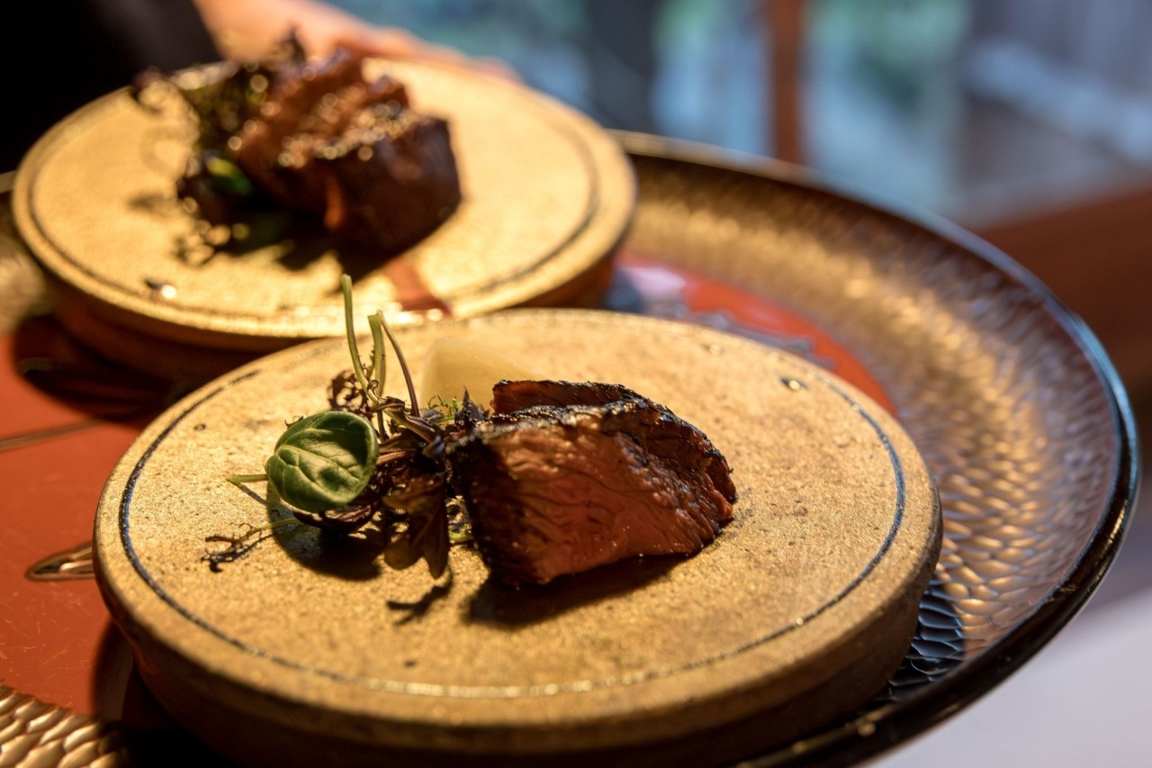 メインは「橋場牛の炭火焼き」。北山シェフの故郷、金居原の古老がつくる良質な竹炭「金改炭」を使って炙った。