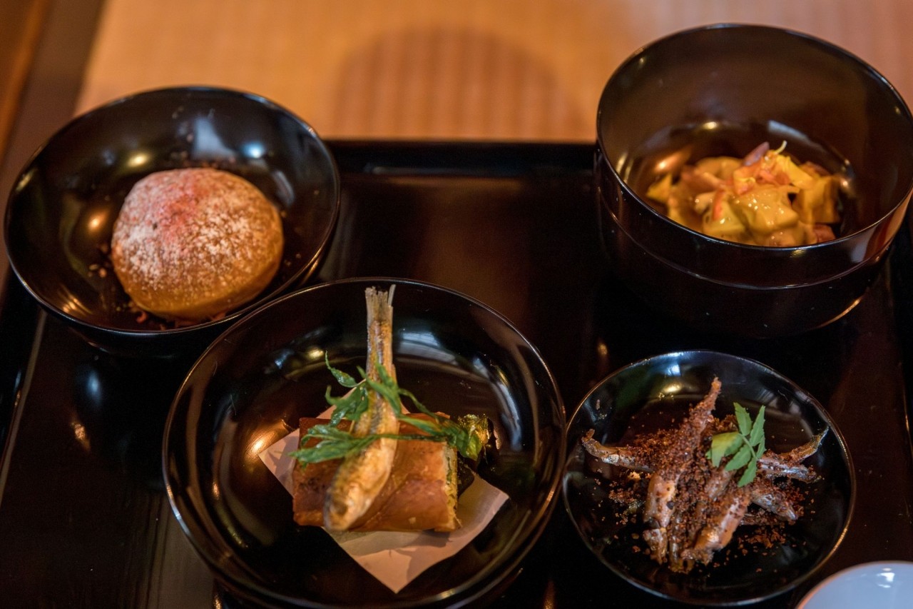 「琵琶湖五味五食五法」。琵琶湖の岩床鯰、小鮎、本もろこ、ニゴロ鮒、琵琶マスを五味(辛、甘、苦、酸、塩)と技(方法)とで調理。