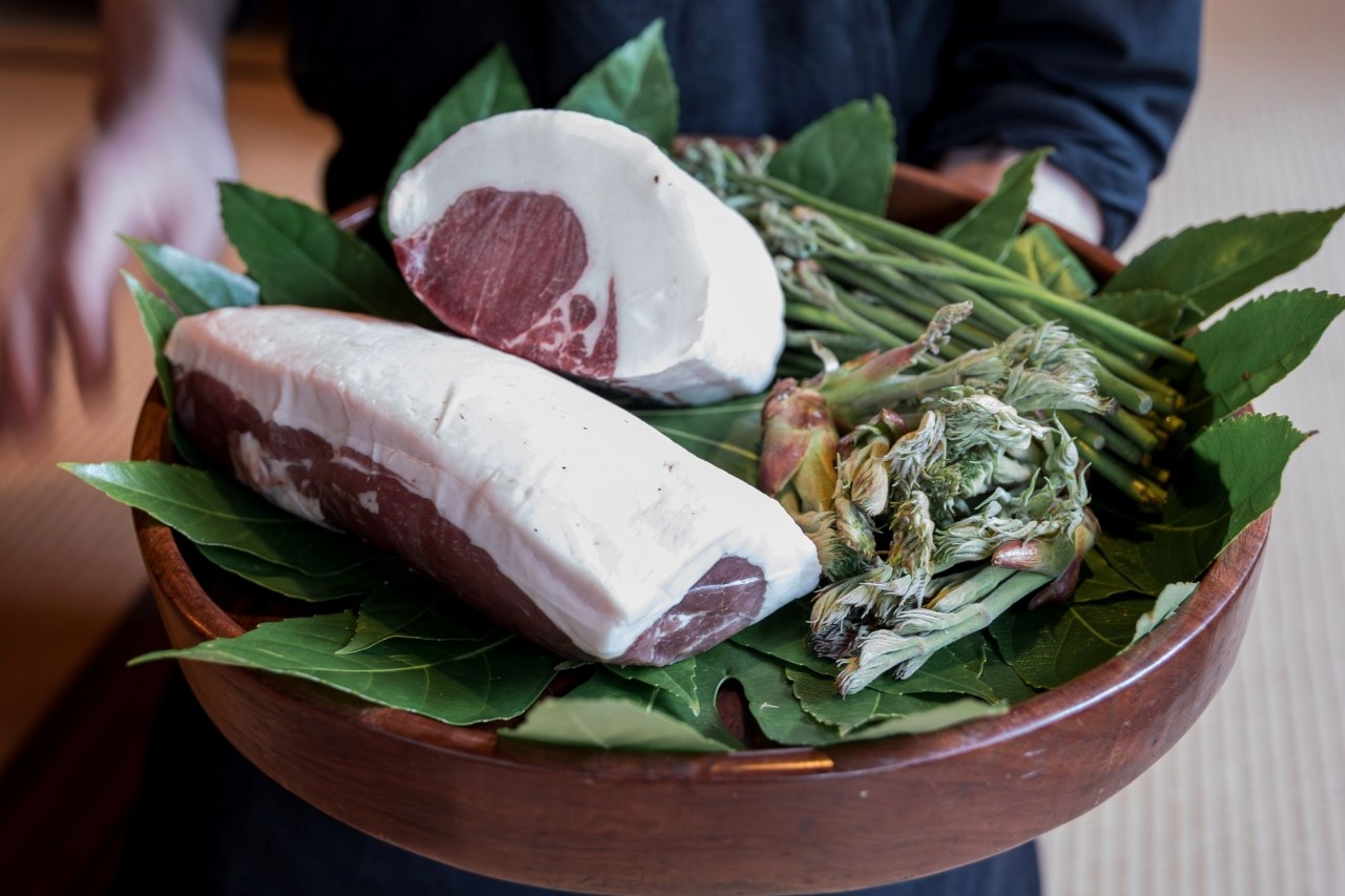 湖北の山の恵みの猪肉。肉厚な脂身。